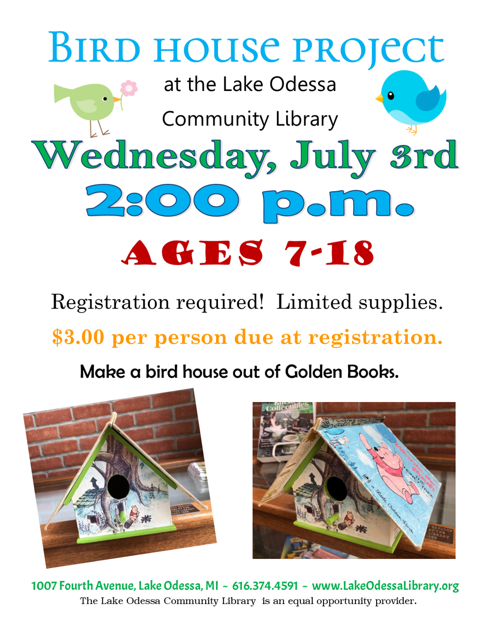 - Ages 7-18 can make a bird house out of Golden Books! Tuesday, July 3rd, at 2pm. Registration required! $3/person. See flyer for more details.