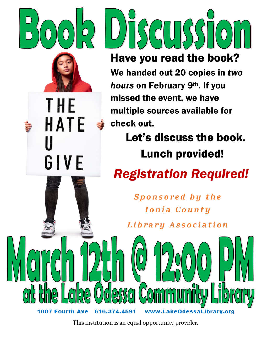 - Come discuss the book "The Hate U Give" on Tuesday, March 12th, at 12:00pm. Enjoy lunch on us while we discuss. Registration is required!