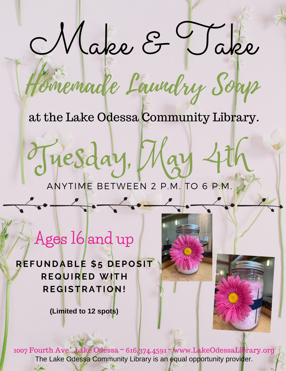 - Make & Take Homemade Laundry Soap! Refundable $5 deposit required with registration. See attached flyer for more details!